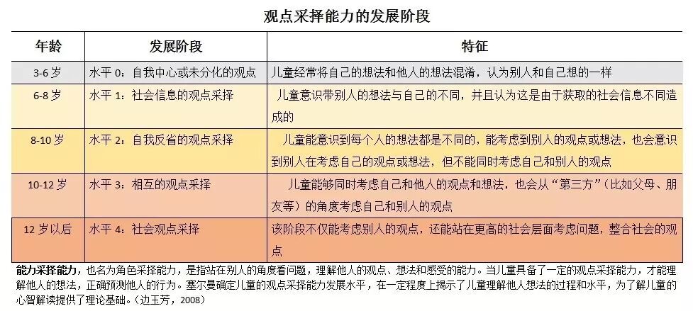 4、情绪:3岁以后儿童就能够将自己内在体验到的情绪与他人表现出的情绪联系起来,并且他们逐渐对于情绪本质与意图有了更深的理解。比如,他们知道了人们表现出的情绪可能和内在体验并不一致;人们对于一件事的情绪反应可能会受到先前的类似事件中的经验或当时的心境影响。(J.Flavell,1998)。